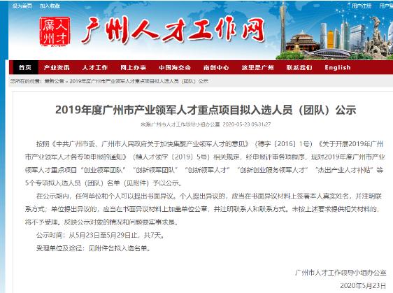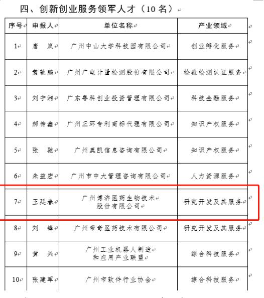 日前,广州市人才工作领导小组办公室印发了《2019年度广州市产业领军人才重点项目拟入选人员(团队)公示》,hth官方入口官方网站 董事长王廷春博士作为创新创业服务领军人才榜上有名,荣膺2019年广州市产业领军人才。