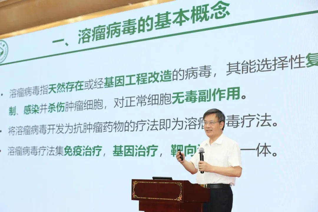 颜光美则以《免疫唤醒:溶瘤病毒M1抗癌的终极机制》为题,向与会者介绍了溶瘤病毒的基本概念和溶瘤病毒M1的生物学特性以及研发历程。颜光美所在课题组详细研究了溶瘤病毒M1抗癌的作用机制并解析了溶瘤病毒M1的三级结构,溶瘤病毒M1能够诱导肿瘤免疫原性死亡并诱导肿瘤微环境发生炎性转变,并能进一步激活DC-T细胞反应。在动物实验中,溶瘤病毒M1能够诱导局部和全身性抗肿瘤T细胞反应,在多种动物模型中展示出显著的抗肿瘤效应。