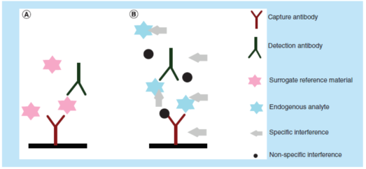 LBA定量测定存在于生物基质中的待测物,无需事先萃取。在理想情况下,捕获/检测试剂应结合(并且仅结合)待测物,保证其不会与任何其它的蛋白发生交叉反应。不幸的是,情况往往并非如此。在现实世界中,生物基质中的内源性蛋白经常阻断试剂与待测物的结合。内源基质干扰物可以特异性地或非特异性地结合捕获/检测试剂或待测物,使得测试信号增加或减少。