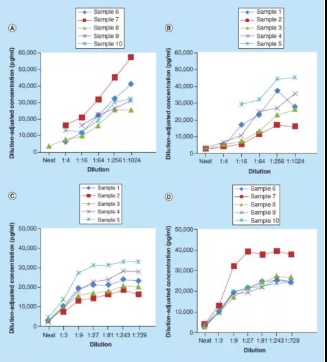 通常,稀释样本的回计算浓度可用于评估定量分析方法的平行性。Stevenson和Purushothama进一步建议,分析人员可绘制稀释后调整的浓度(dilution-adjusted concentration)与多个个人样本稀释的示意图,这可以帮助设定方法的MRD并评估方法的选择性。