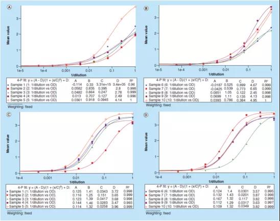 对于LBA定量方法,测试信号与浓度/稀释倍数之间的相关性通常不是线性的。因此,线性关系图不能准确反映样本之间的平行性。建议使用加权或无加权的4或5参数logistic回归(4PL或5PL)模型,以实现最小方差的最佳曲线拟合。从图中直接可以看到每个样本稀释曲线的平行关系,并可以评价样本之间的平行性。一个局限是不清楚如何为"原始测试信号"方法设置固定的接受标准。每个样本的"B"参数("B"表示4PL和5PL的希尔曲线斜率)可用于评估方法平行性。也可以进一步评估并应用更多的统计方法,以便更好地解释数据。