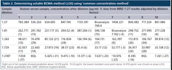 常用稀释方法(common dilution method)是将在最大稀释倍数时给出平行响应的所有单个样本中观察到的最高浓度定为LLOQ。但使用该种办法时存在一个不足,就是当至少一个样本的内源性浓度明显高于其他样品时,确定的LLOQ将高于真正的LLOQ。而另一种方法,共同浓度方法(common concentration method)是将所有样品都表现出平行性的最高浓度确定为LLOQ。换言之,任何高于确定LLOQ浓度的样本,都通过平行实验表现出相对的准确度。对sBCMA案例研究的数据,使用了"共同浓度方法"(表2)。