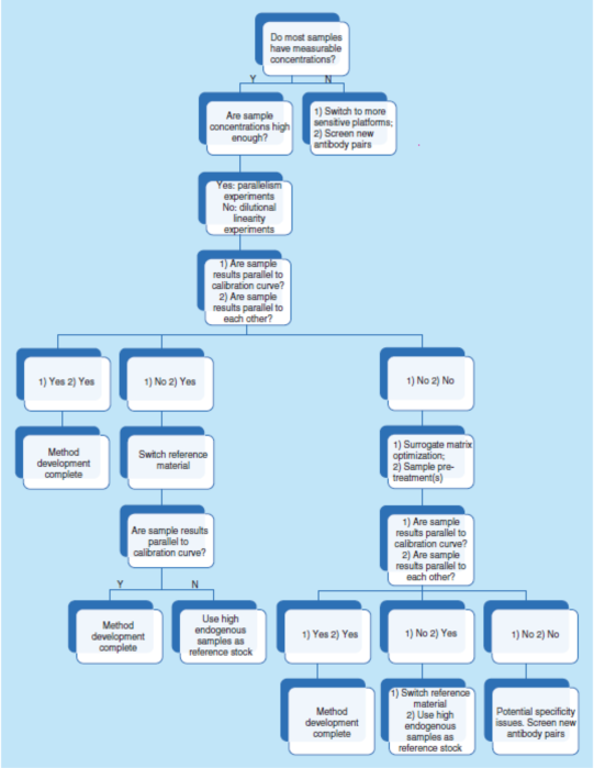 简而言之,需要确认参考照(比)物料和关键试剂的质量和批次间的变异性,也需要确认或重新建立测试方法的LLOQ和MRD,也可能需要优化缓冲液和稀释剂,并且在有必要时优化检测步骤。而评估上述所有内容最有效的方法则是通过平行性实验。因此,强烈建议在方法开发的早期阶段进行平行性实验。如果在研究期间观察到非平行性,则建议使用相同的故障排除路线(见图5)。