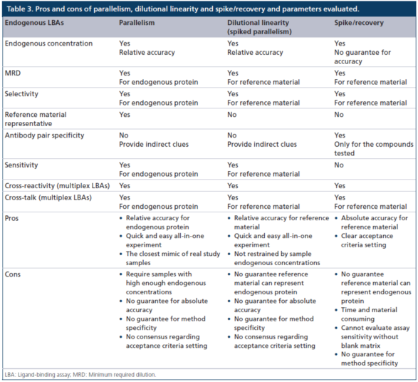 表3显示了使用平行性、稀释线性度(加标平行性)和加标/回收方法来评估内源性LBA方法关键参数的优缺点。与大多数外源性药物的定量方法不同,内源性(例如,生物标志物)LBA方法通常需要替代参照(比)标准物和不含有待测物的替代基质。用于内源性LBA的照(比)标准物,通常既非高度纯化,也非表征良好,且很可能不能完全代表待测的内源性蛋白质,这些蛋白质通常是异质性(heterogeneous)的,在其天然基质中存在着多个异构体(isoforms)。