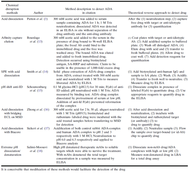 表1. 用于破坏ADA-药物复合物,以提高ADA检测灵敏度的方法