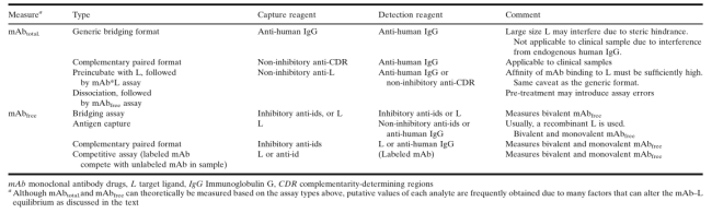 对特异于mAbfree的测试格式,一对试剂中至少有一个试剂必须与待测物的同一位点结合。这些试剂可能是与L竞争结合的anti-idiotypic抗体(即inhibitory anti-ids)或者是L本身(图2c, d)。这种分析方式的一个变种源自试剂的组合应用(例如,“桥接bridging”格式中,使用相同的试剂捕获和检测mAb,L作为捕获试剂,与anti-idiotypic抗体进行结合检测,反之亦然)。桥接格式的一个优点是为了能够被检测到,mAb必须要有两个functionally free结合位点。使用L的捕获方式要求mAb只有一个供检测的游离结合位点,并且对游离和部分游离的药物都有特异性。但分析结果并没有揭示这两种形式的相对比例。