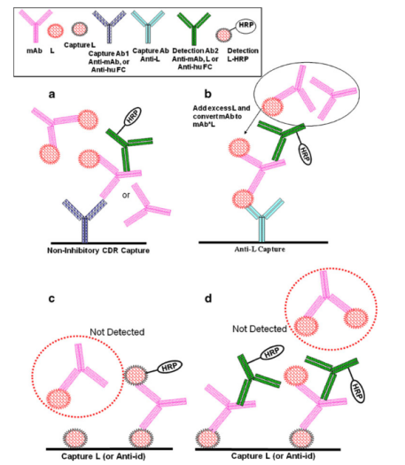 图 2. 典型的测定mAbtotal或mAbfree的ELISA示意图。mAbtotal的测定方法:a. mAbtotal:捕获抗体non-inhibitory anti-CDR,检测抗体anti-hu IgG。b. mAbtotal:与L预孵育转化为mAbtotal-L,捕获抗体non-inhibitory anti-L,检测抗体anti-human IgG 或non-inhibitory anti-CDR。mAbfree的分析方法:c.二价mAbfree:与L作为捕获及检测的桥接分析方法。d.用于二价和单价的mAbtotal-L的捕获与检测。