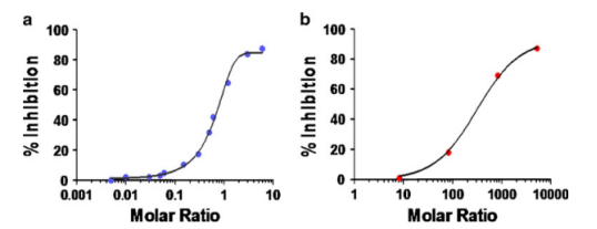 图 3. L干扰mAb的测试。a. mAbfree的分析方法的示例:L/mAb摩尔比在大约0.7时的抑制率为50%;b. mAbtotal的分析方法的示例:L/mAb摩尔比约为300时,抑制率为50%。