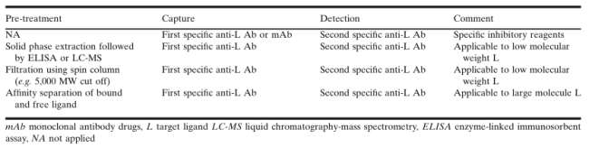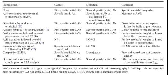 此外,在疾病模型或特定患者群体中,靶标配体的状况可能与健康对照群体有着非常不同的情况,所以了解在不同物种和疾病状态中出现的mAb/L比值的可变性也很重要。即使拥有高度表征的试剂,也应该理解mAb-L在体内是以动态平衡的方式存在的,因此体外(ex vivo)的测试条件(例如样本稀释和孵育时间)会影响mAb和L的定量以及它们两者之间的平衡,可以通过研究mAb-L平衡,分析操作步骤,评估实验结果,来判断它们是否真实反映了研究样本中的结合关系(binding relationships)。本文的表格中所列出的样品处理策略和定量方法,经常适用于方法开发,其目的是定量分析游离(free)的、总体(total)的和结合了(bound)的mAb和L的各种形式。