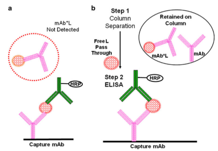 另一种方法是通过分子筛、固相萃取或亲和分离法,在LBA分析之前,去除结合形式的L(图5b,如使用G蛋白、A蛋白或抗人FC柱)。然而,由于柱子或过滤器表面的吸附作用,这些额外的步骤可能会带来误差,而且在这些分离过程中也可能会发生解离。因此,Lfree的数据只能显示出相对的趋势,而不能作为绝对的定量结果。