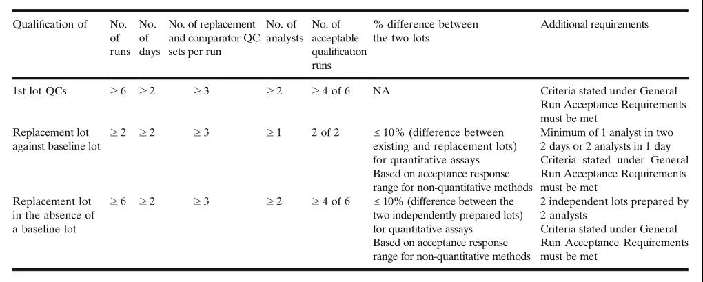 此处的一般运行接受标准适用于现有和替换QC批次的认证。此处下列术语:基线批次(baseline QC lots)、遗留QC批次(legacy lots)或QC比较批次(comparator QC lots)可互换使用。