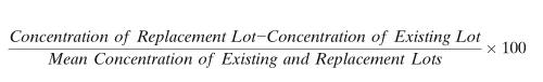 定量LBA方法中,替换QC批次的认证,应当以常规运行接受标准中的规定为基础,同时也应当以其与现有合格QC批次的可比性(comparability)为基础。例如,可比性标准可包括现有批次和替换批次之间±10%或以下的差异。使用现有和替换QC样品的测量浓度,可以用下面的公式确定差异百分比值(%)。