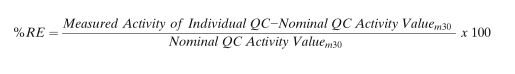 在这种情况下,可以通过建立QC的标称活性值(nominal activity value)来克服这个局限性。每个浓度级别的标称QC活性值可以,由至少2人,根据至少30次合格运行的平均测定活性值,在至少10-20天内建立。每次运行至少应包含3组QC样品。所有合格运行的平均活性测定值,即为QC的标称活性值,并可以使用下面的公式计算单个QC样品的%RE:
