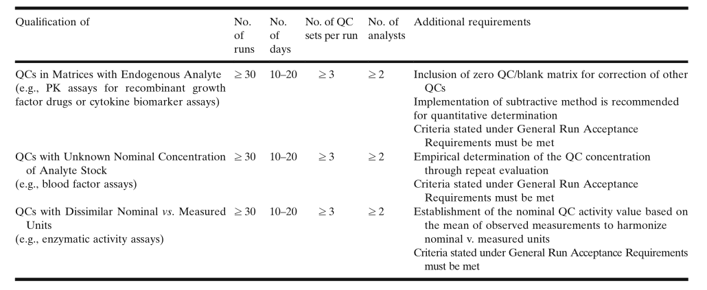 可能存在这样的情况,即可能不存在遗留的,经认证合格的QC样品,因为这些QC样品已经用完或过期。不存在可比较QC的情况下,建议使用不同的中间原液(intermediate stocks),由不同的分析人员,分别制备两个批次的QC样品。从实际操作上,可以指定一个批次,可能是批量较大的,为主要批次(primary lot);另一批次,可能是小批量的,就作为参照品(comparator),对主要批次进行认证。对主要和次要批次的对比测试应由2人进行,每人使用独立制备的标准曲线进行测试,每人进行3次测试,至少分2天进行,总共运行6次。至少4/6 (2/3)的QC认证运行应该满足接受标准。也应满足上述的常规运行接受标准。两个替换批次的QC样品应满足±10%或更严格的偏差标准,保证二者中任何一个批次均可接受。表1总结了这些认证要求。