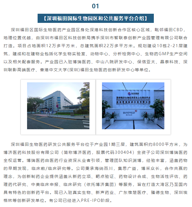 深圳福田生物医药研发公共服务平台为深圳福田区力主打造的生物医药产业区域高地,该平台由深圳博瑞(hth官方入口官方网站 全资子公司)负责运营管理,已有包括真实生物、新声药业、广东惟楚医疗、臻德生物、深圳埃格林等创新研发单位入驻,部分入驻企业已经进入PRE-IPO阶段。目前公共服务平台有少量空余单位,向全球招商入驻企业。